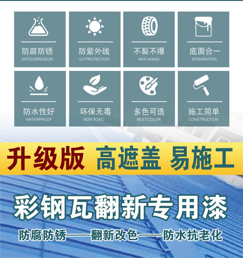 | 顏色(可調(diào)) | 施工法式刷涂、輥涂、噴涂 | 適用范圍彩鋼瓦、石棉瓦、集裝箱、廠房頂棚、鋼制門窗 |